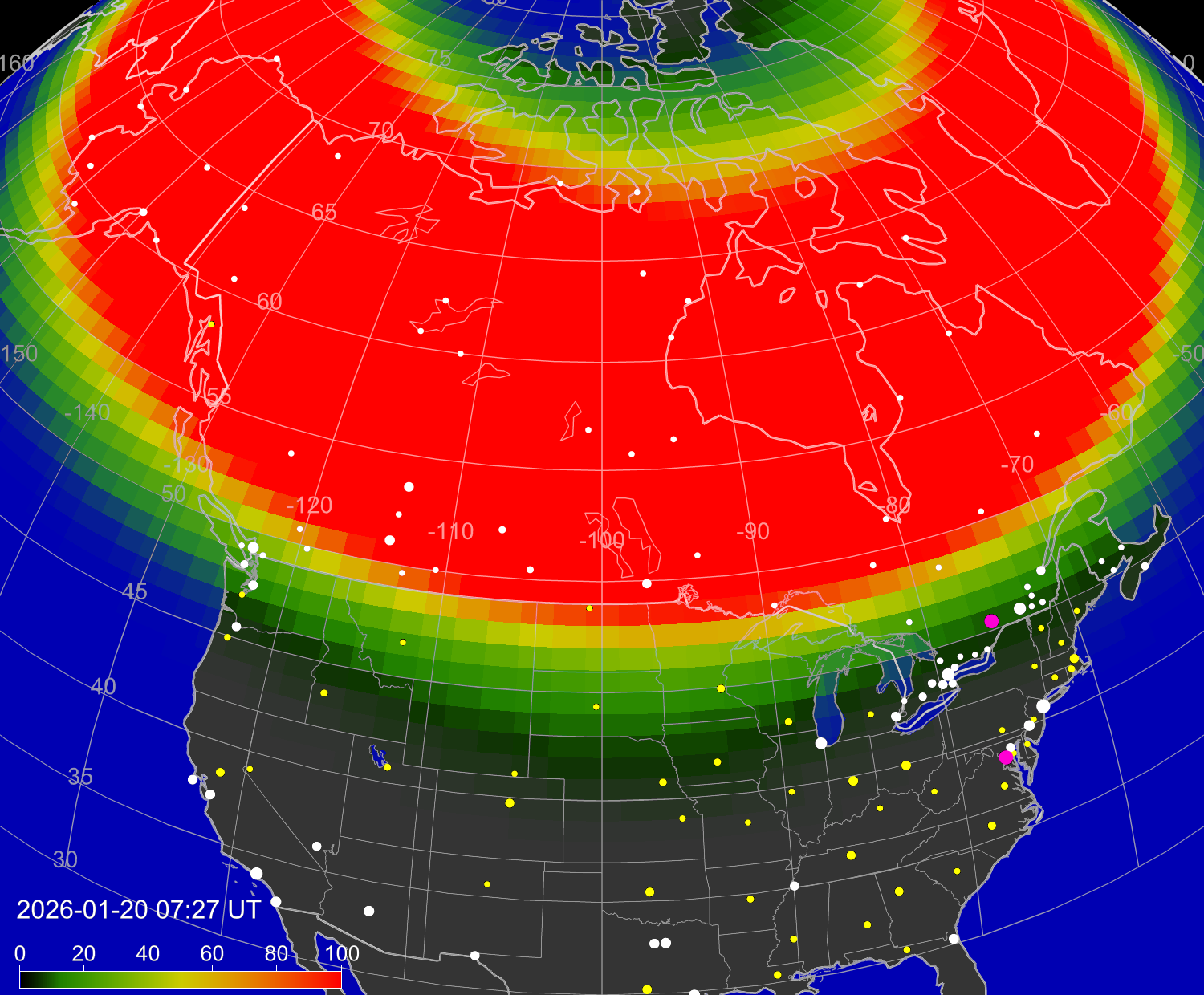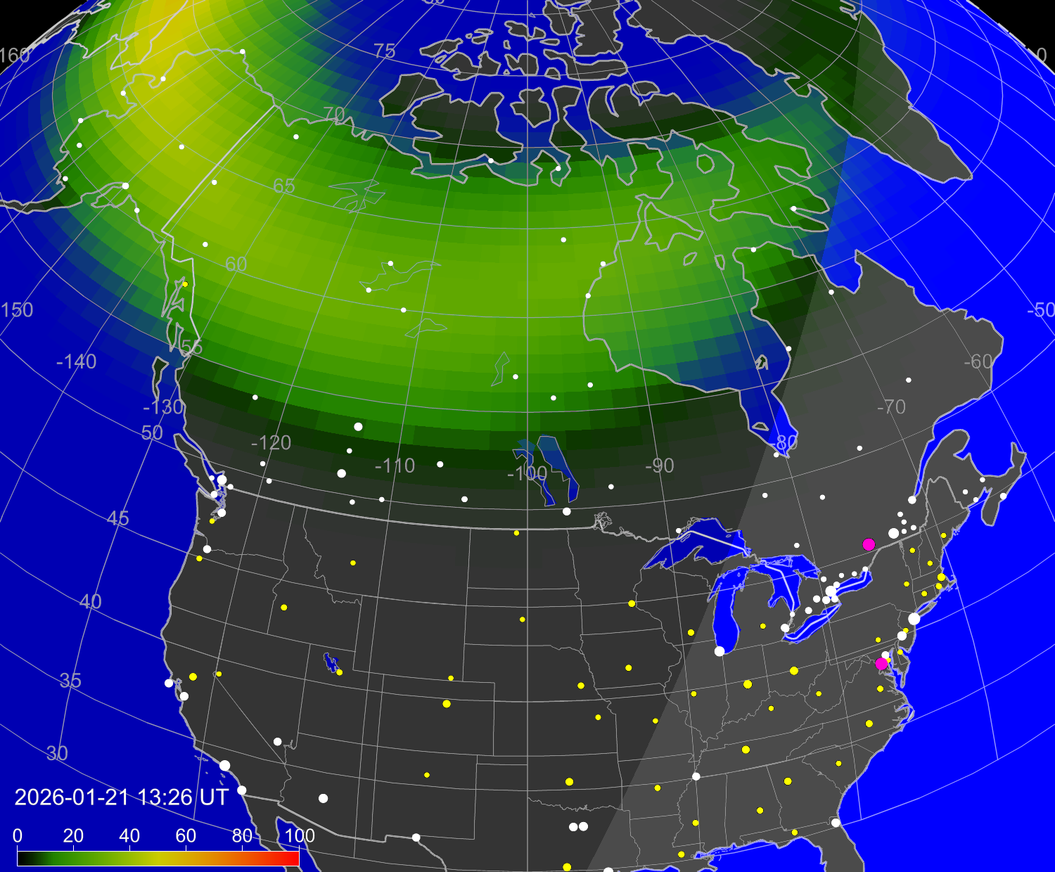 Изменения и часовой прогноз индекса интенсивности полярных сияний с 2026-01-20 по 2026-01-21