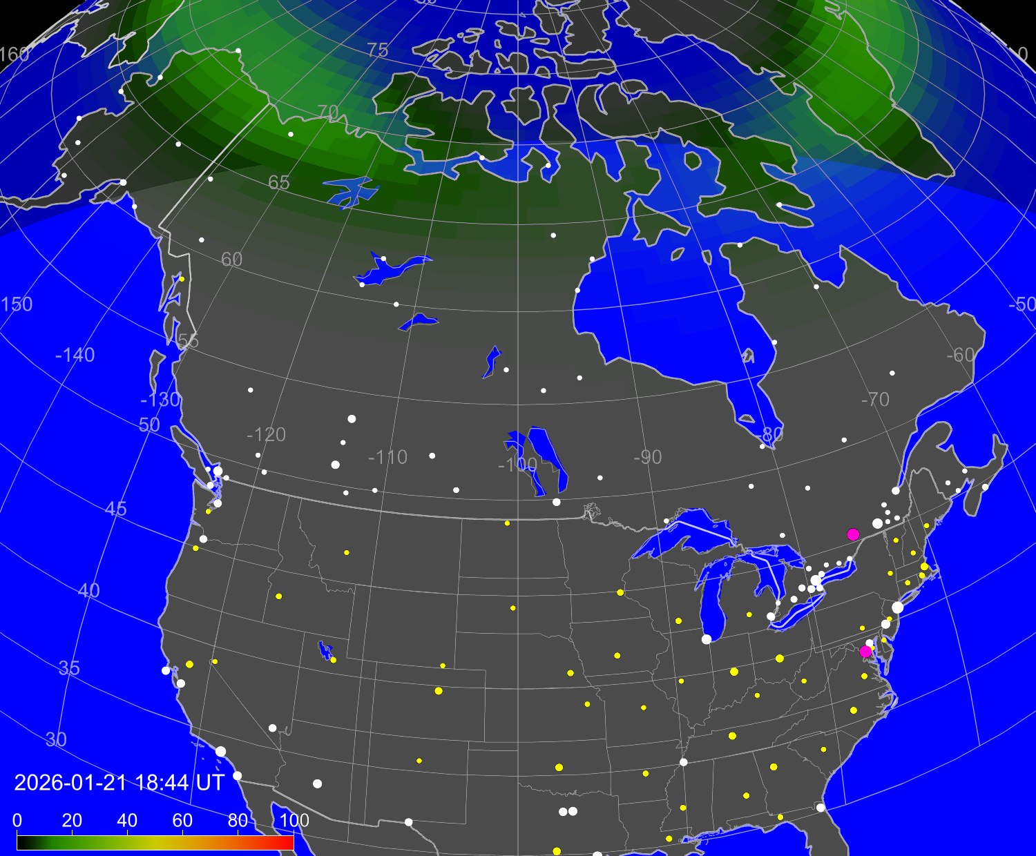 Индекс интенсивности полярных сияний и теоретически возможная широта наблюдений для ночного времени в западном полушарии