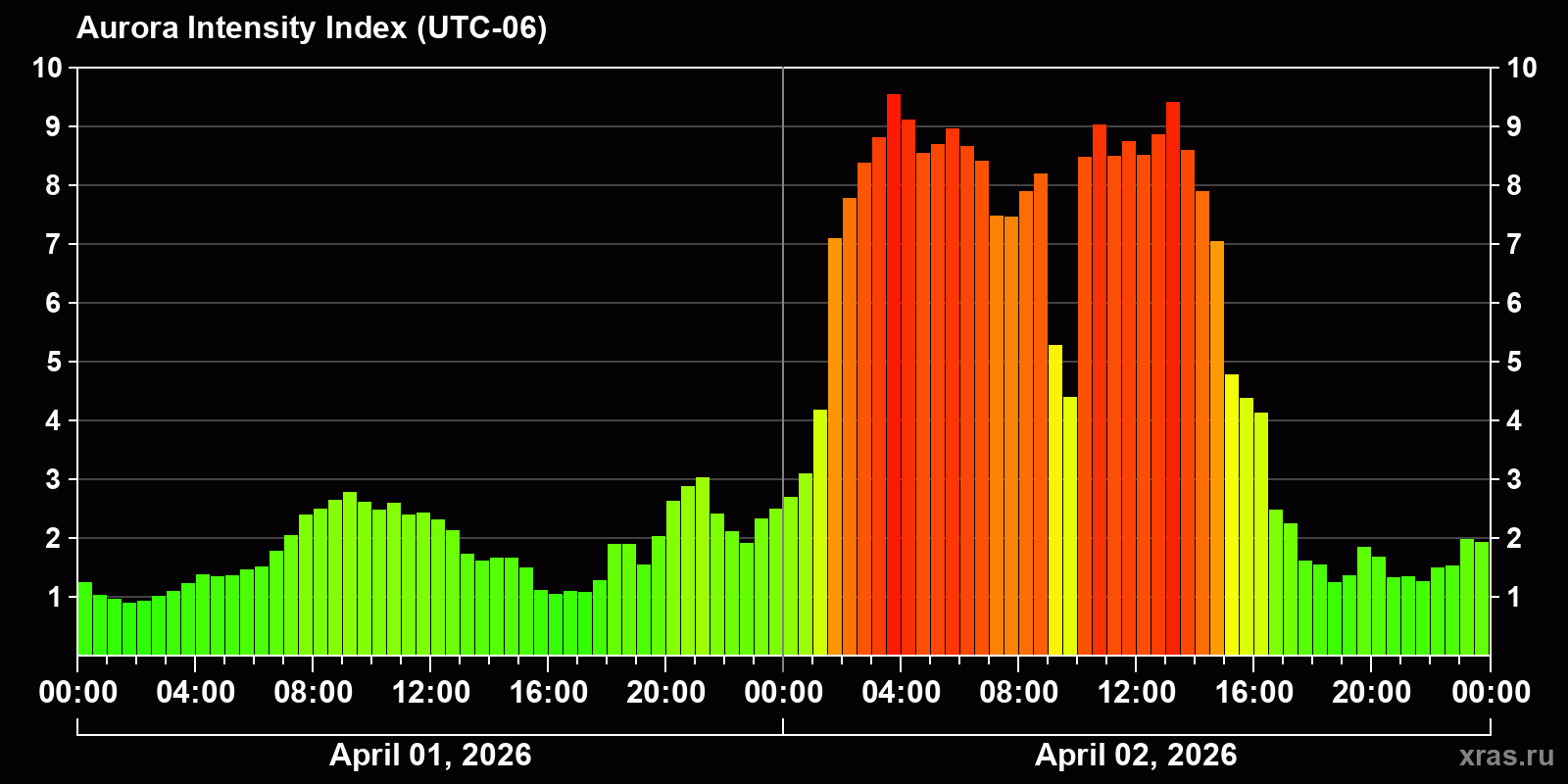 Changes in the auroral intensity index from 2026-04-01 to 2026-04-02 local time