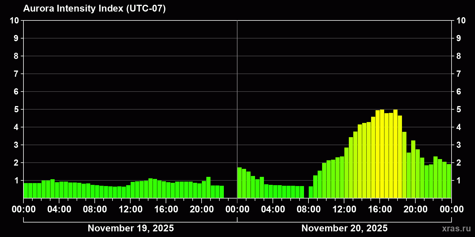 Changes in the auroral intensity index from 2025-11-19 to 2025-11-20 local time