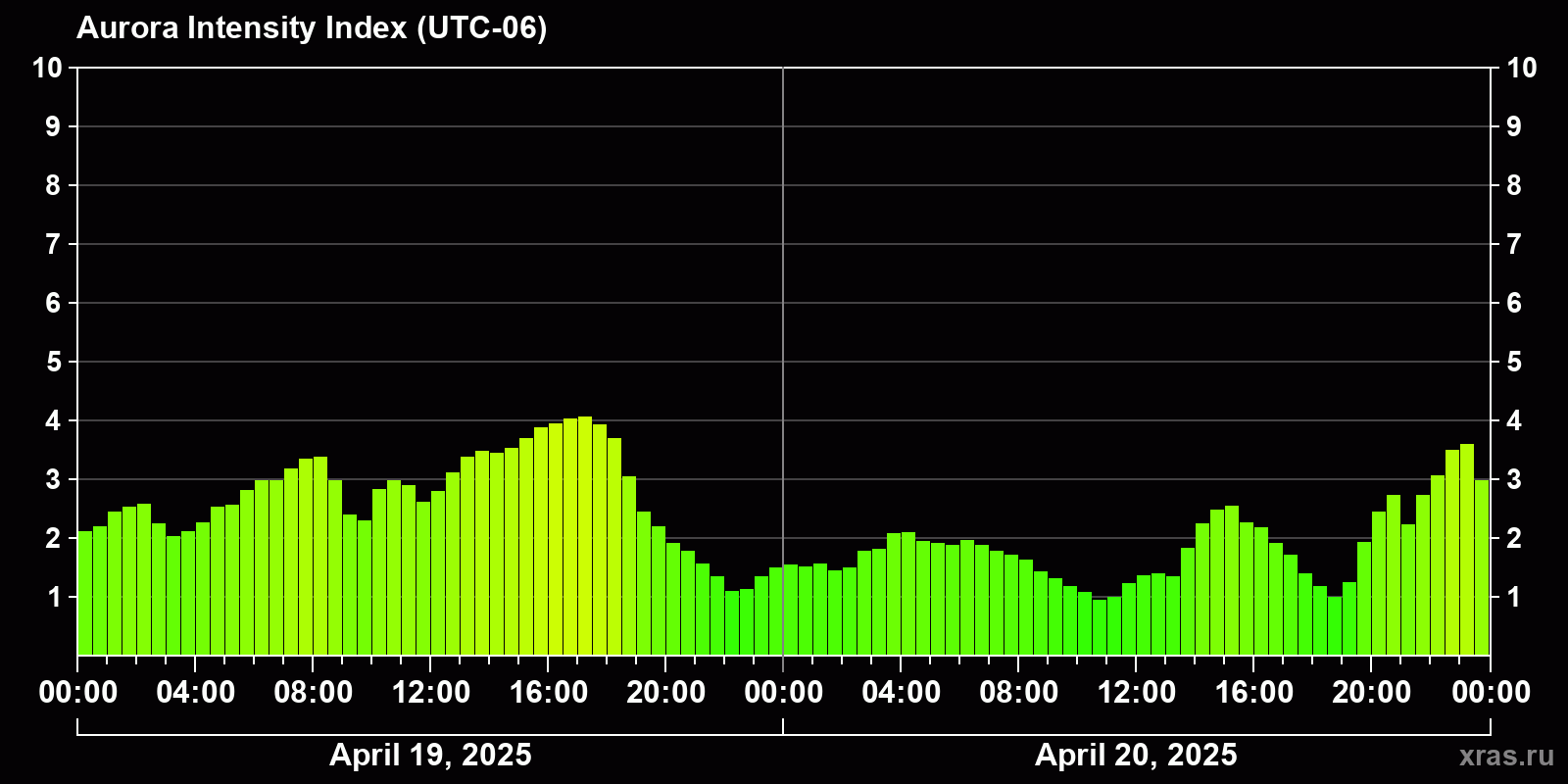 Changes in the auroral intensity index from 2025-04-19 to 2025-04-20 local time