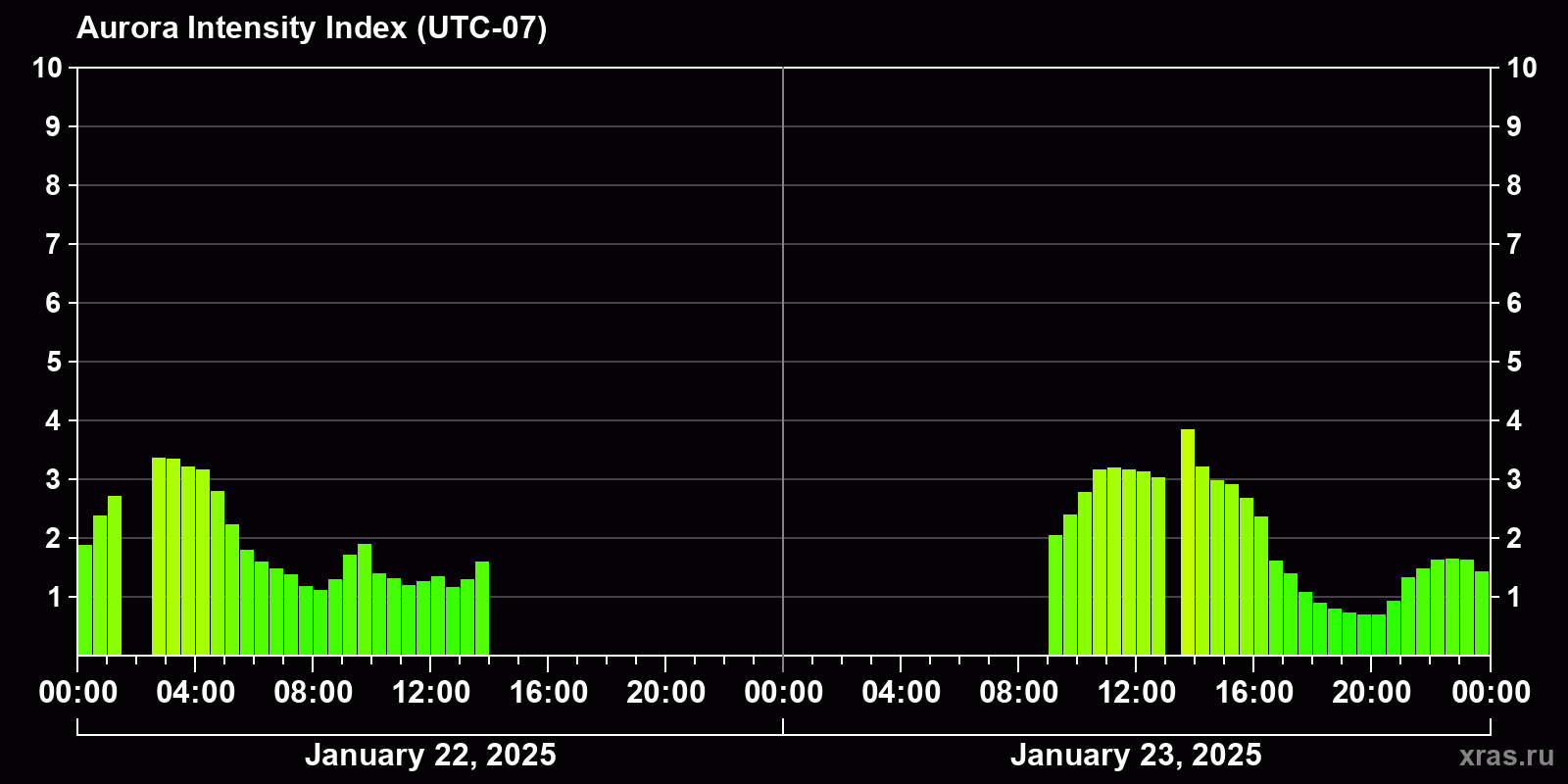 Auroral intensity index and the theoretically possible latitude of observations for nighttime in the Western Hemisphere as of 2025-01-23 23:53 (end of day) local time