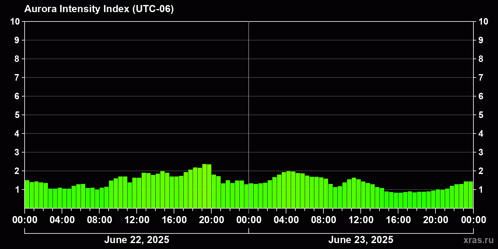 Auroral intensity index and the theoretically possible latitude of observations for nighttime in the Western Hemisphere as of 2025-06-23 23:59 (end of day) local time