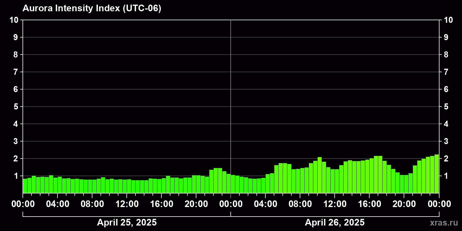 Changes in the auroral intensity index from 2025-04-25 to 2025-04-26 local time