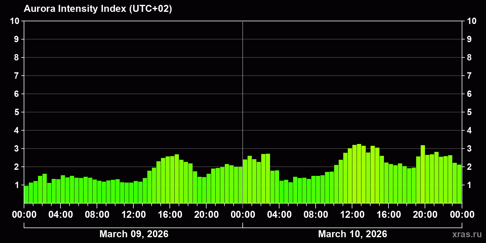 Changes in the auroral intensity index from 2026-03-09 to 2026-03-10 local time