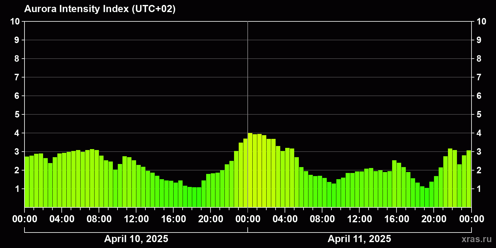 Auroral intensity index and the theoretically possible latitude of observations for nighttime in the Estern Hemisphere as of 2025-04-11 23:55 (end of day) local time