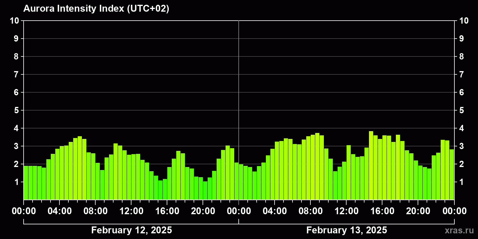 Auroral intensity index and the theoretically possible latitude of observations for nighttime in the Estern Hemisphere as of 2025-02-13 23:49 (end of day) local time