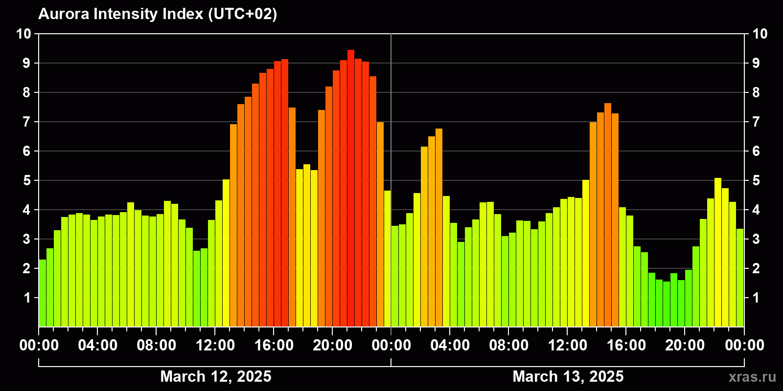 Auroral intensity index and the theoretically possible latitude of observations for nighttime in the Estern Hemisphere as of 2025-03-13 23:48 (end of day) local time