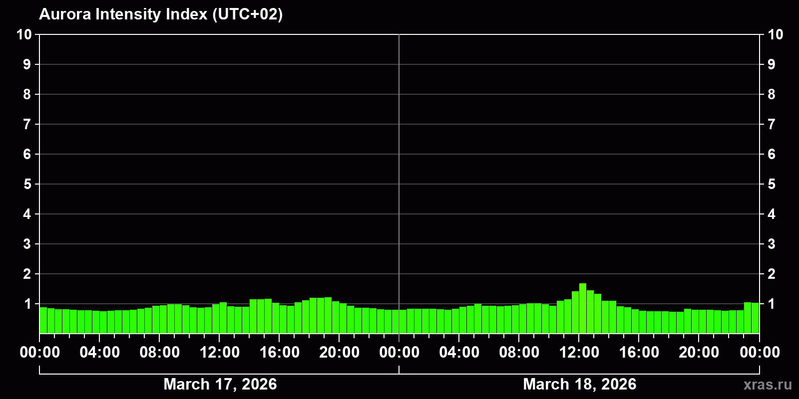 Changes in the auroral intensity index from 2026-03-17 to 2026-03-18 local time