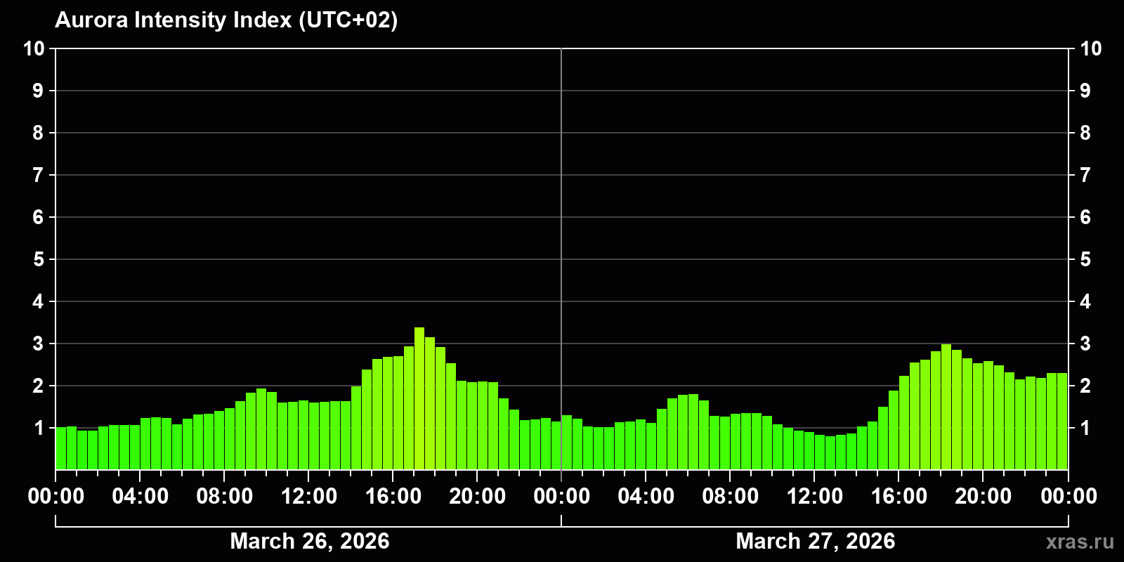 Changes in the auroral intensity index from 2026-03-26 to 2026-03-27 local time