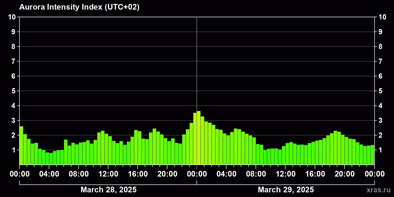 Changes in the auroral intensity index from 2025-03-28 to 2025-03-29 local time