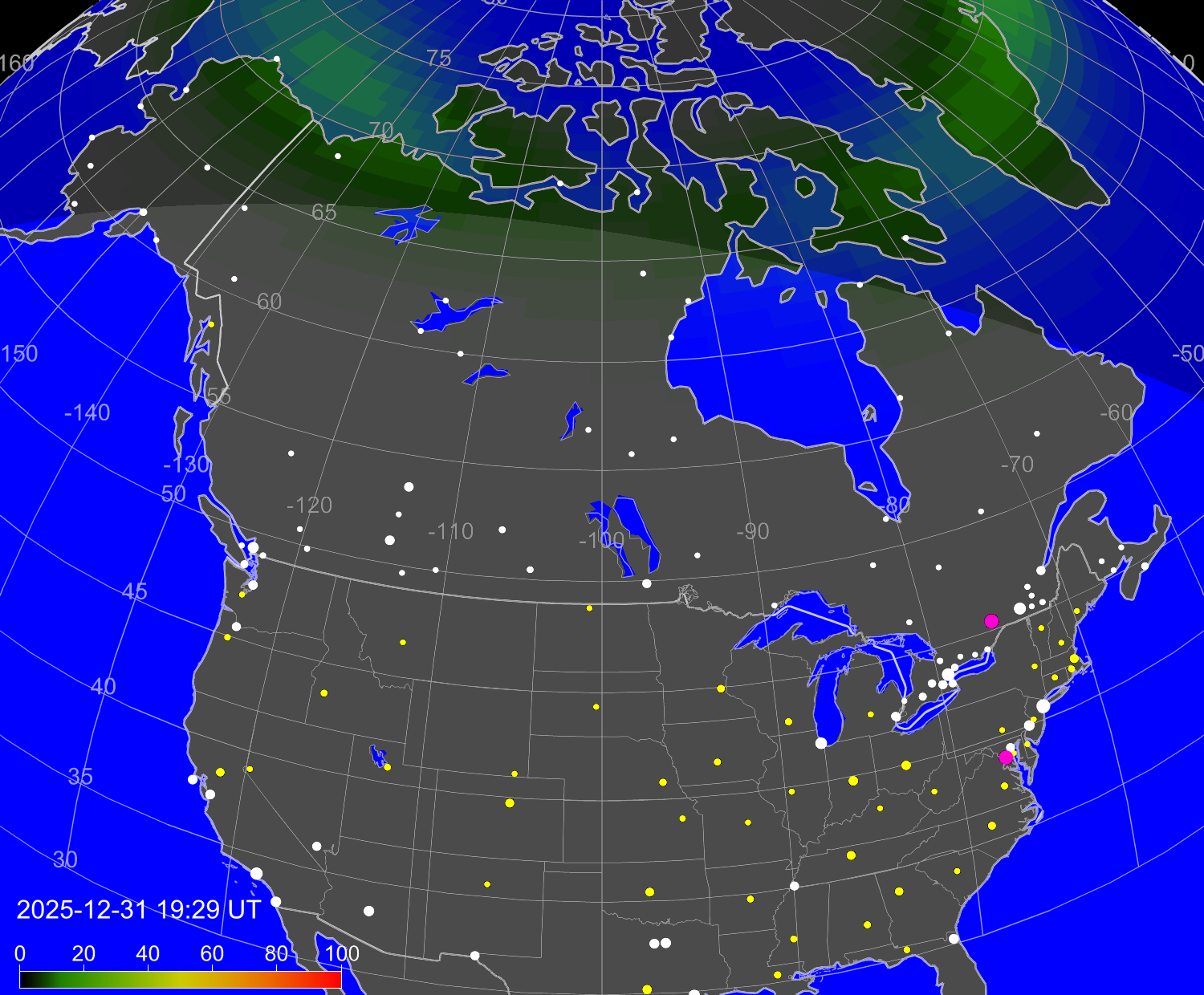 Вероятность полярных сияний в городах США