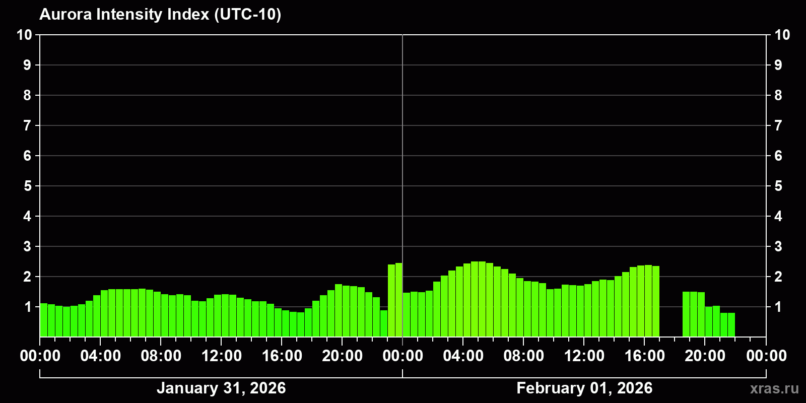 Auroral intensity index and the theoretically possible latitude of observations for nighttime in the Western Hemisphere as of 2026-02-01 21:54 (end of day) local time