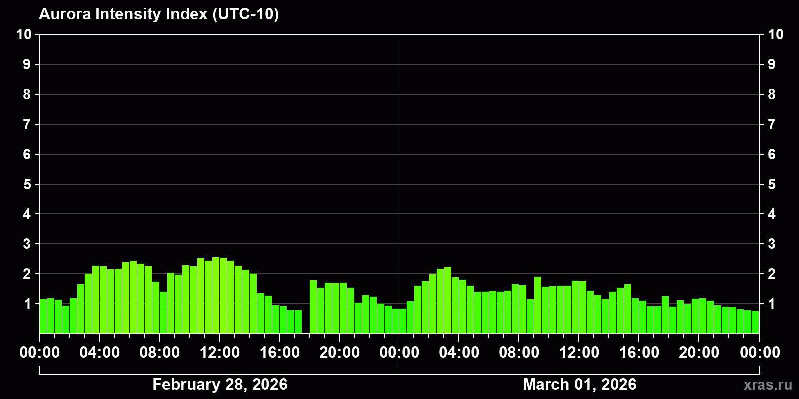 Changes in the auroral intensity index from 2026-02-28 to 2026-03-01 local time