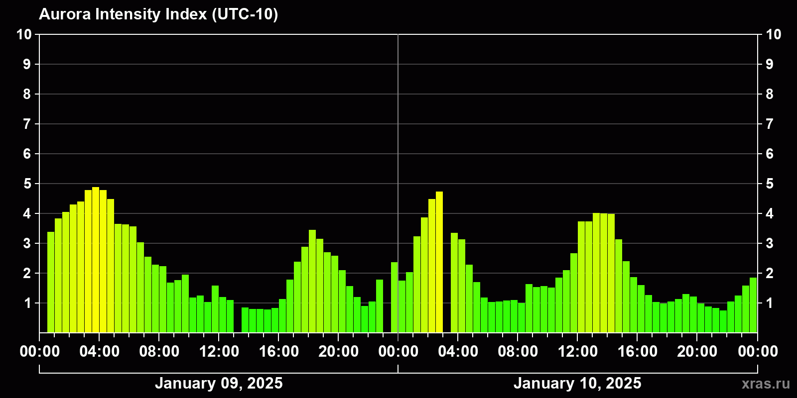 Auroral intensity index and the theoretically possible latitude of observations for nighttime in the Western Hemisphere as of 2025-01-10 23:32 (end of day) local time