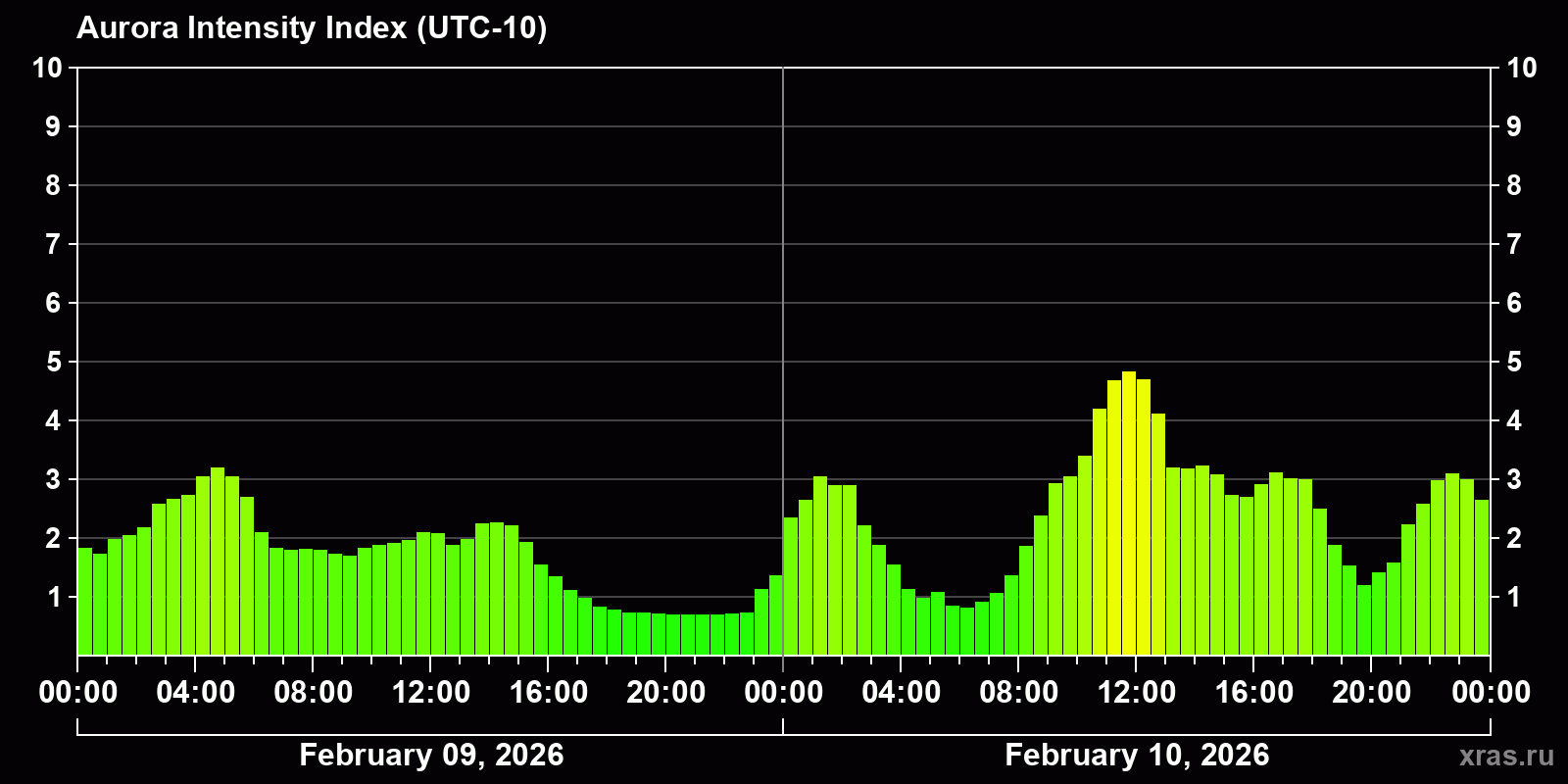 Auroral intensity index and the theoretically possible latitude of observations for nighttime in the Western Hemisphere as of 2026-02-10 23:58 (end of day) local time