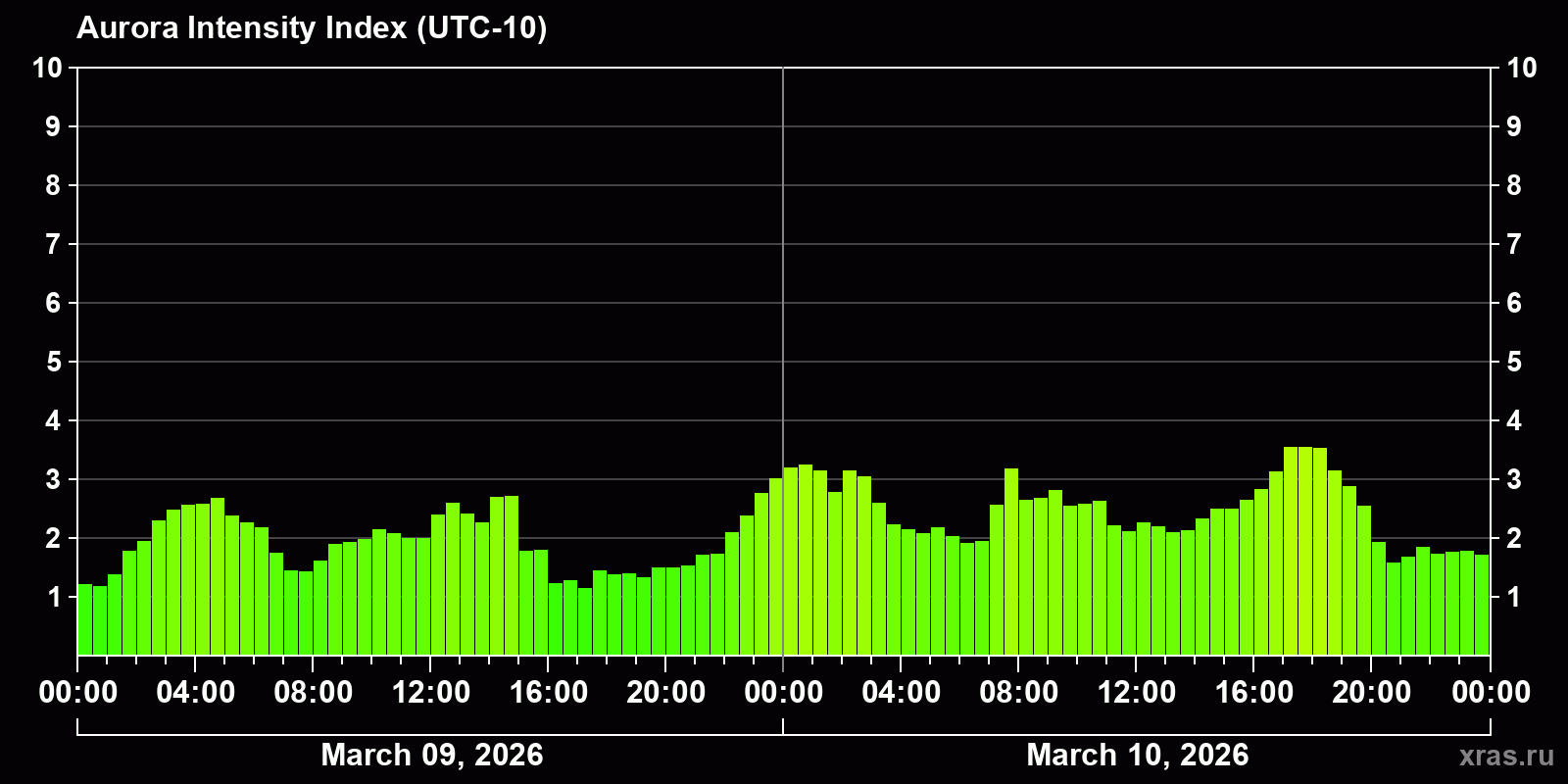 Changes in the auroral intensity index from 2026-03-09 to 2026-03-10 local time