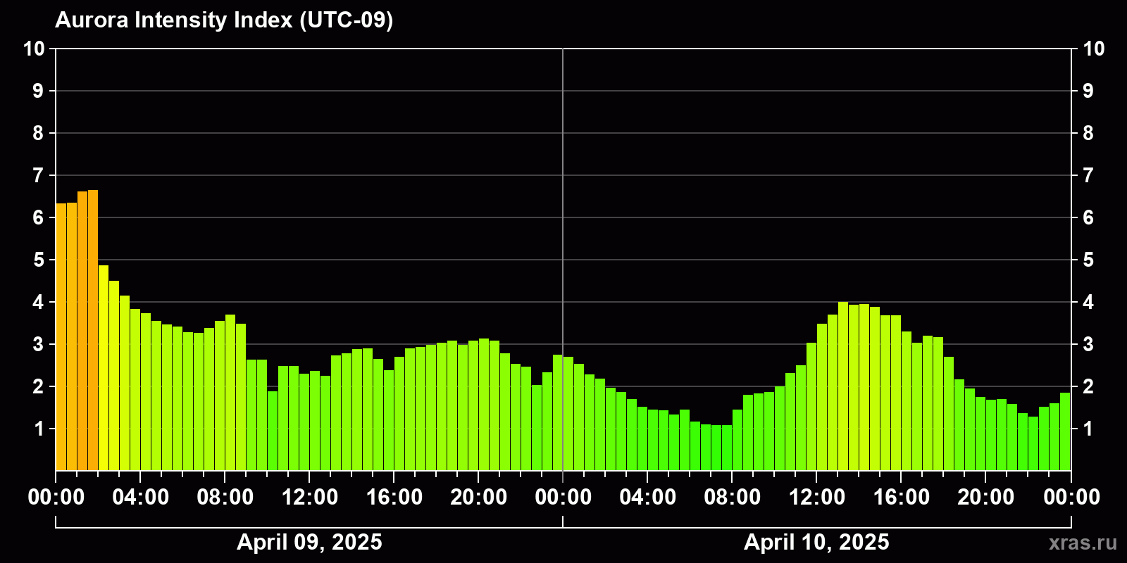 Changes in the auroral intensity index from 2025-04-09 to 2025-04-10 local time