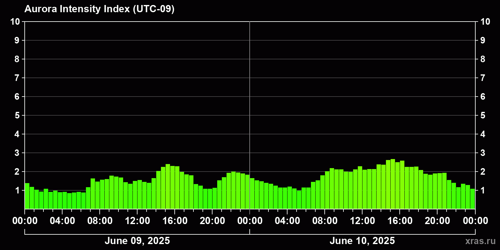 Changes in the auroral intensity index from 2025-06-09 to 2025-06-10 local time