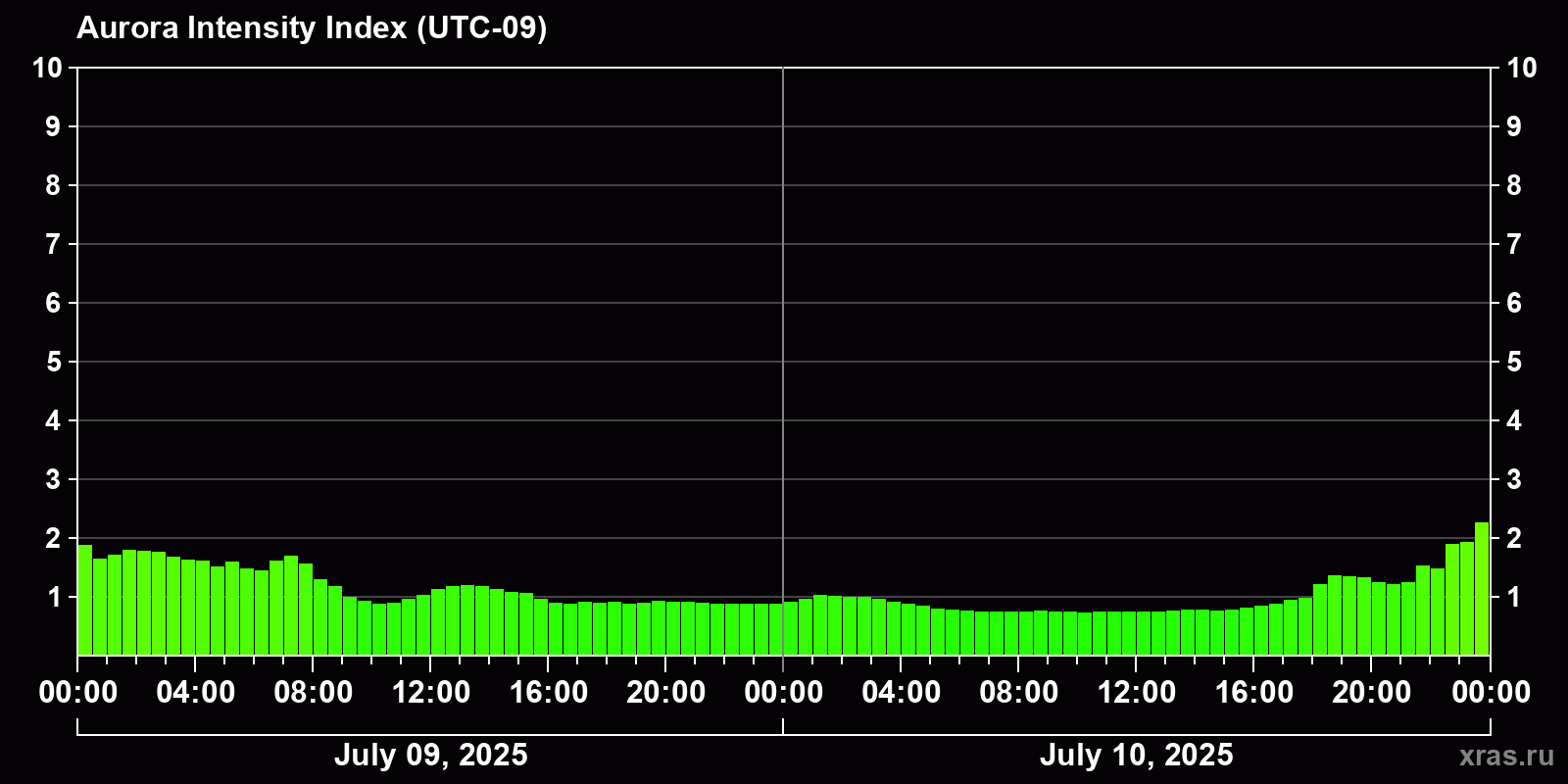 Changes in the auroral intensity index from 2025-07-09 to 2025-07-10 local time