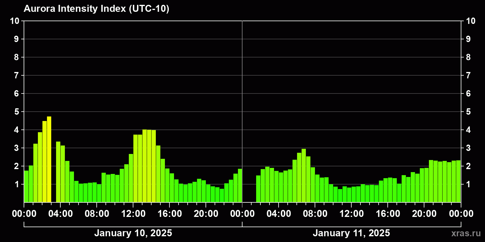Changes in the auroral intensity index from 2025-01-10 to 2025-01-11 local time