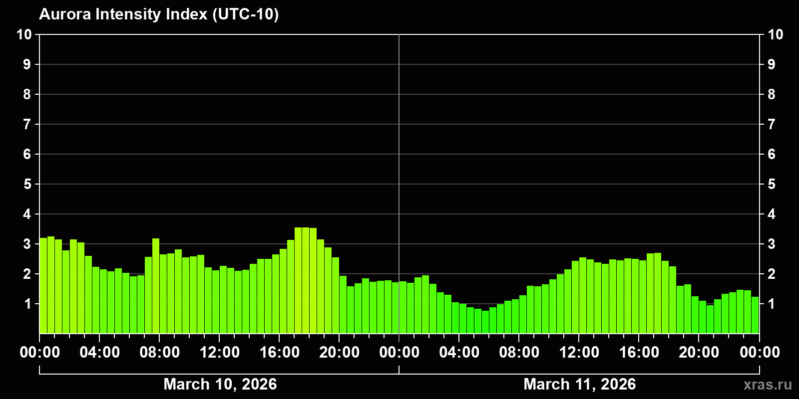 Changes in the auroral intensity index from 2026-03-10 to 2026-03-11 local time