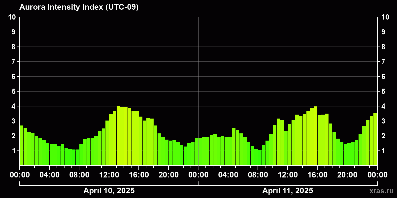 Changes in the auroral intensity index from 2025-04-10 to 2025-04-11 local time