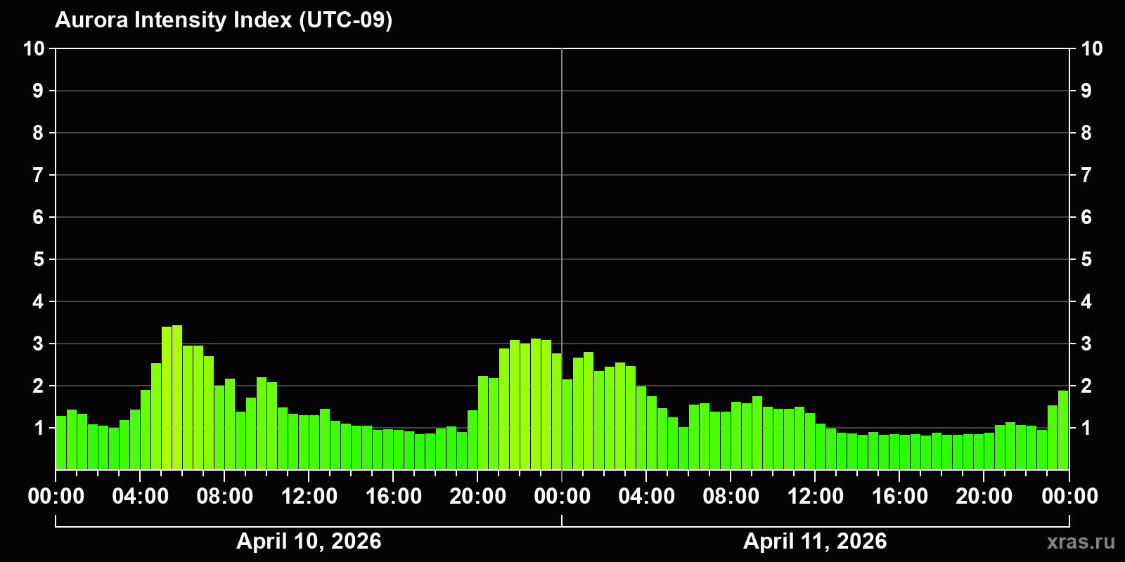 Changes in the auroral intensity index from 2026-04-10 to 2026-04-11 local time