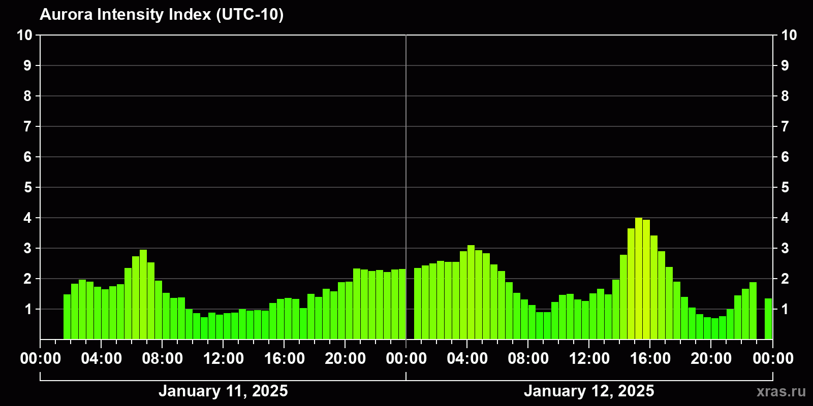 Changes in the auroral intensity index from 2025-01-11 to 2025-01-12 local time