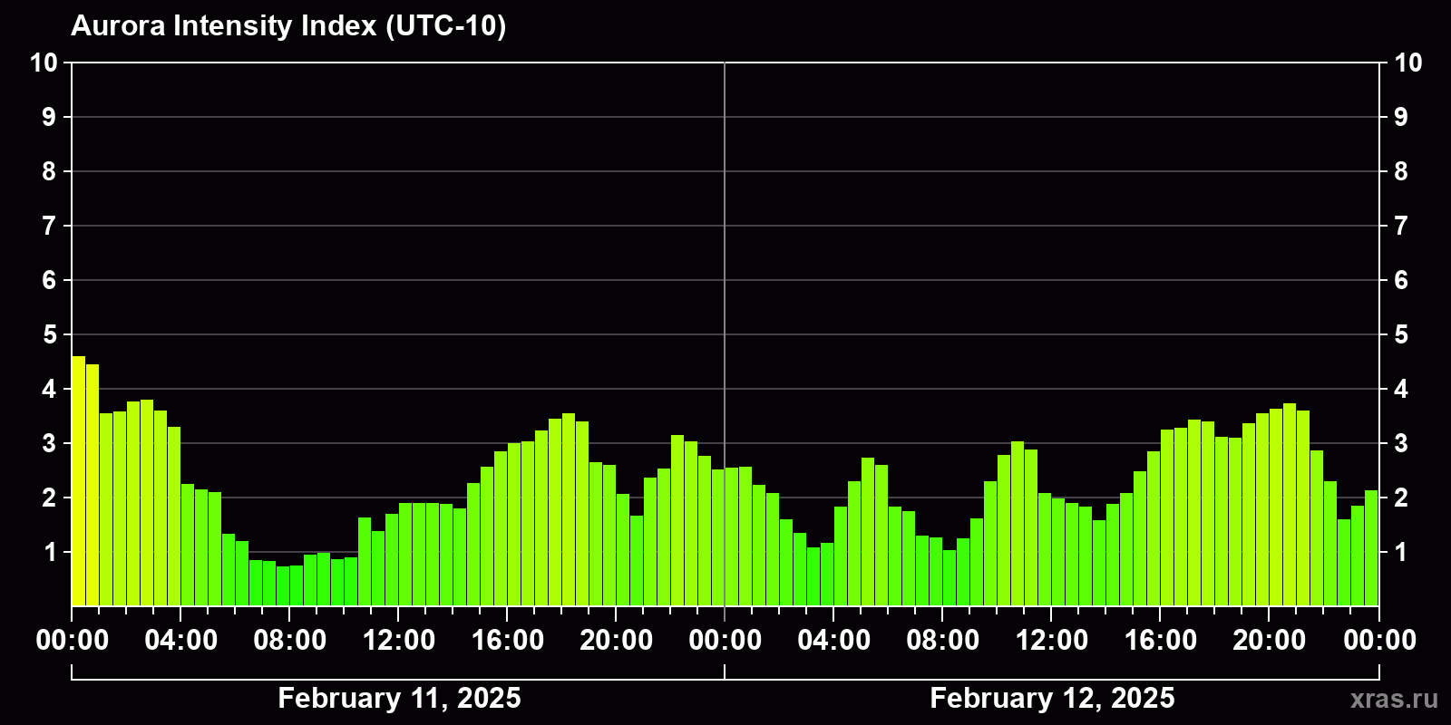 Changes in the auroral intensity index from 2025-02-11 to 2025-02-12 local time