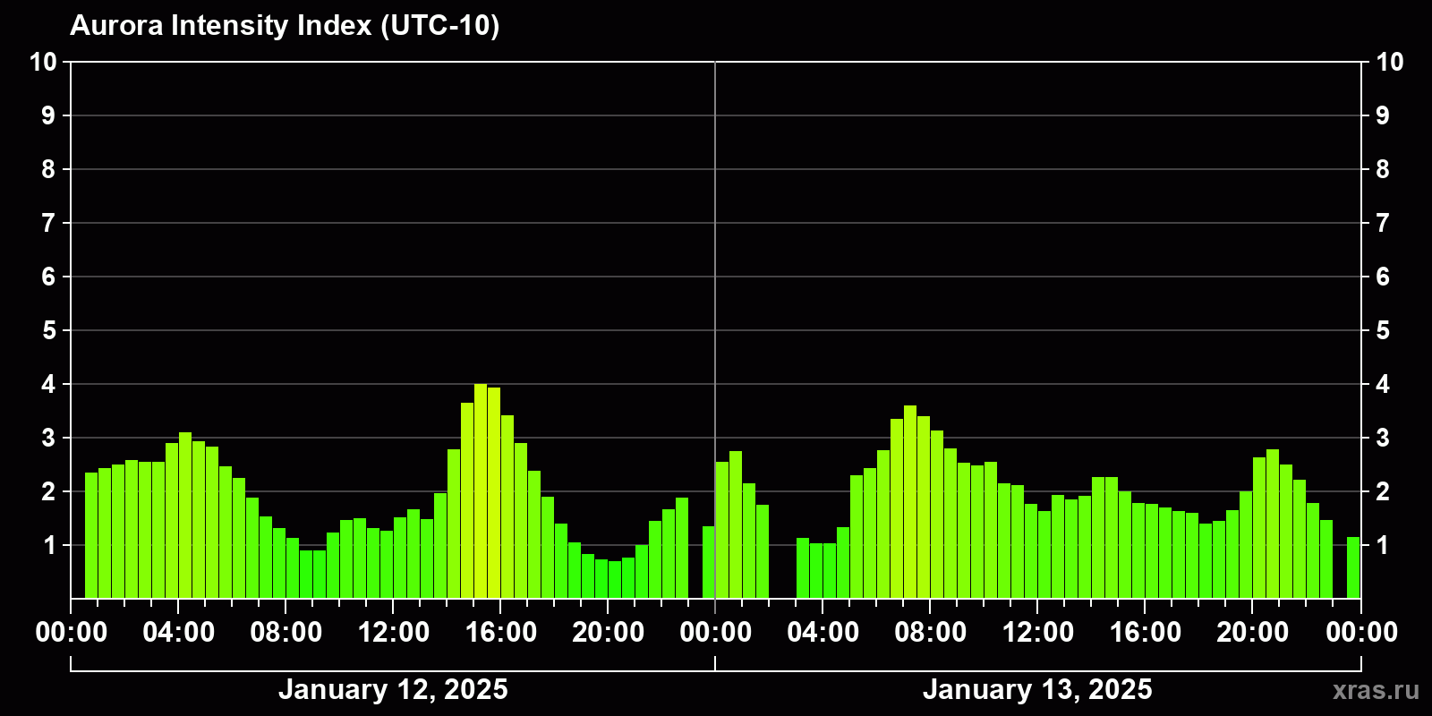 Changes in the auroral intensity index from 2025-01-12 to 2025-01-13 local time