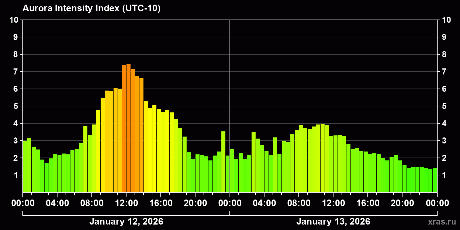 Changes in the auroral intensity index from 2026-01-12 to 2026-01-13 local time