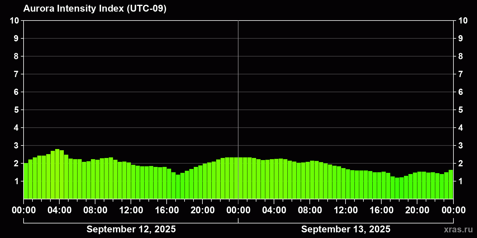 Auroral intensity index and the theoretically possible latitude of observations for nighttime in the Western Hemisphere as of 2025-09-13 23:55 (end of day) local time