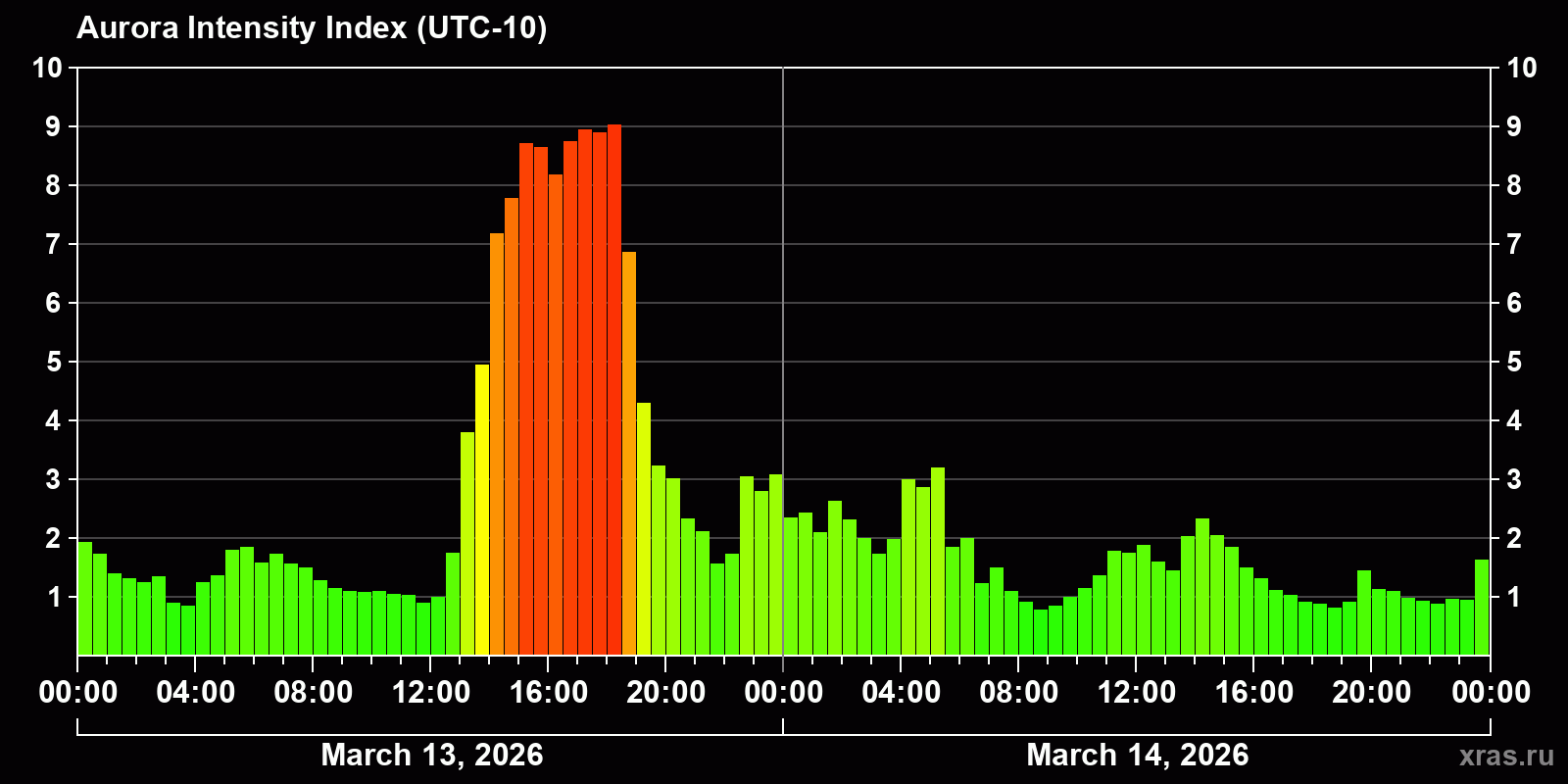 Changes in the auroral intensity index from 2026-03-13 to 2026-03-14 local time