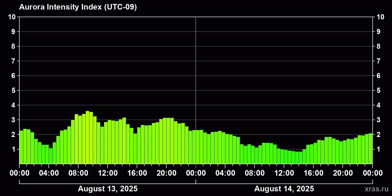 Changes in the auroral intensity index from 2025-08-13 to 2025-08-14 local time