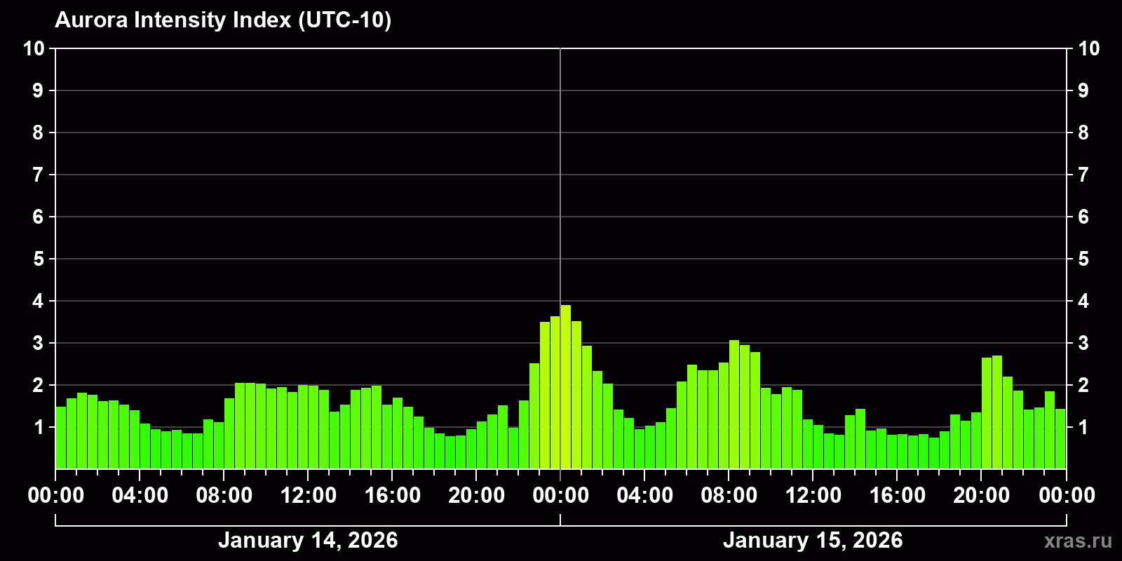 Changes in the auroral intensity index from 2026-01-14 to 2026-01-15 local time