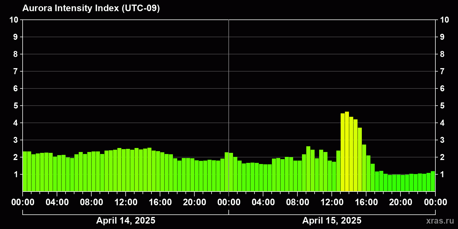 Changes in the auroral intensity index from 2025-04-14 to 2025-04-15 local time