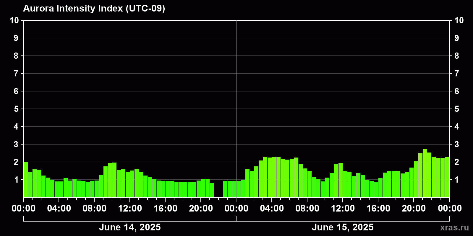 Auroral intensity index and the theoretically possible latitude of observations for nighttime in the Western Hemisphere as of 2025-06-15 23:54 (end of day) local time