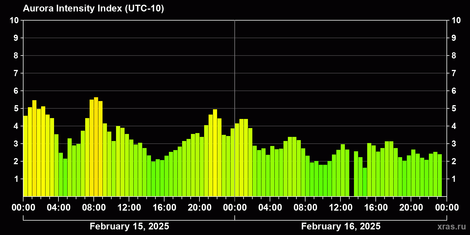 Auroral intensity index and the theoretically possible latitude of observations for nighttime in the Western Hemisphere as of 2025-02-16 23:18 (end of day) local time