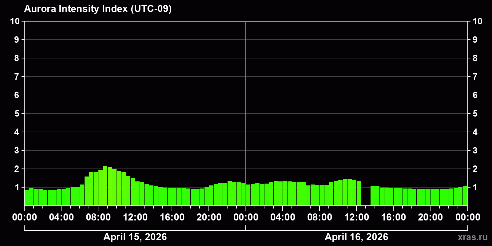 Changes in the auroral intensity index from 2026-04-15 to 2026-04-16 local time