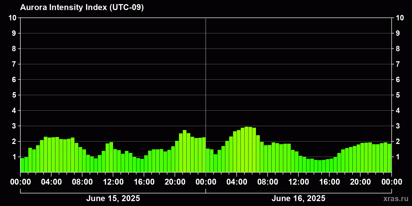 Changes in the auroral intensity index from 2025-06-15 to 2025-06-16 local time