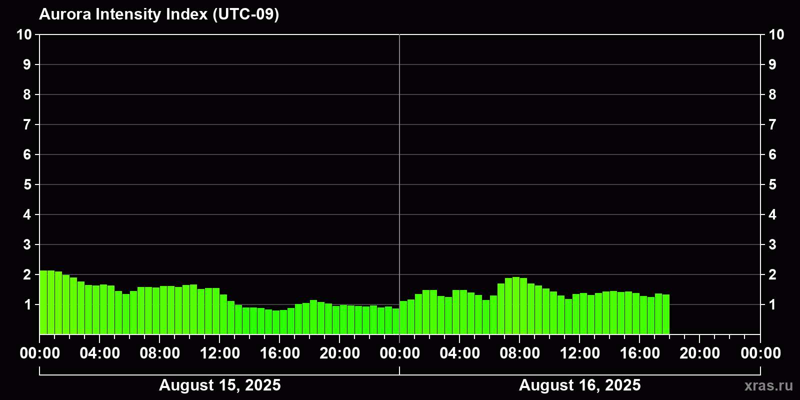 Changes in the auroral intensity index from 2025-08-15 to 2025-08-16 local time