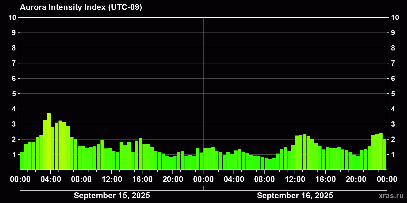 Changes in the auroral intensity index from 2025-09-15 to 2025-09-16 local time