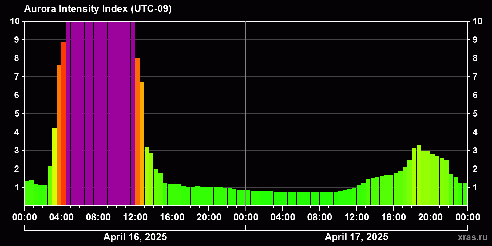 Changes in the auroral intensity index from 2025-04-16 to 2025-04-17 local time