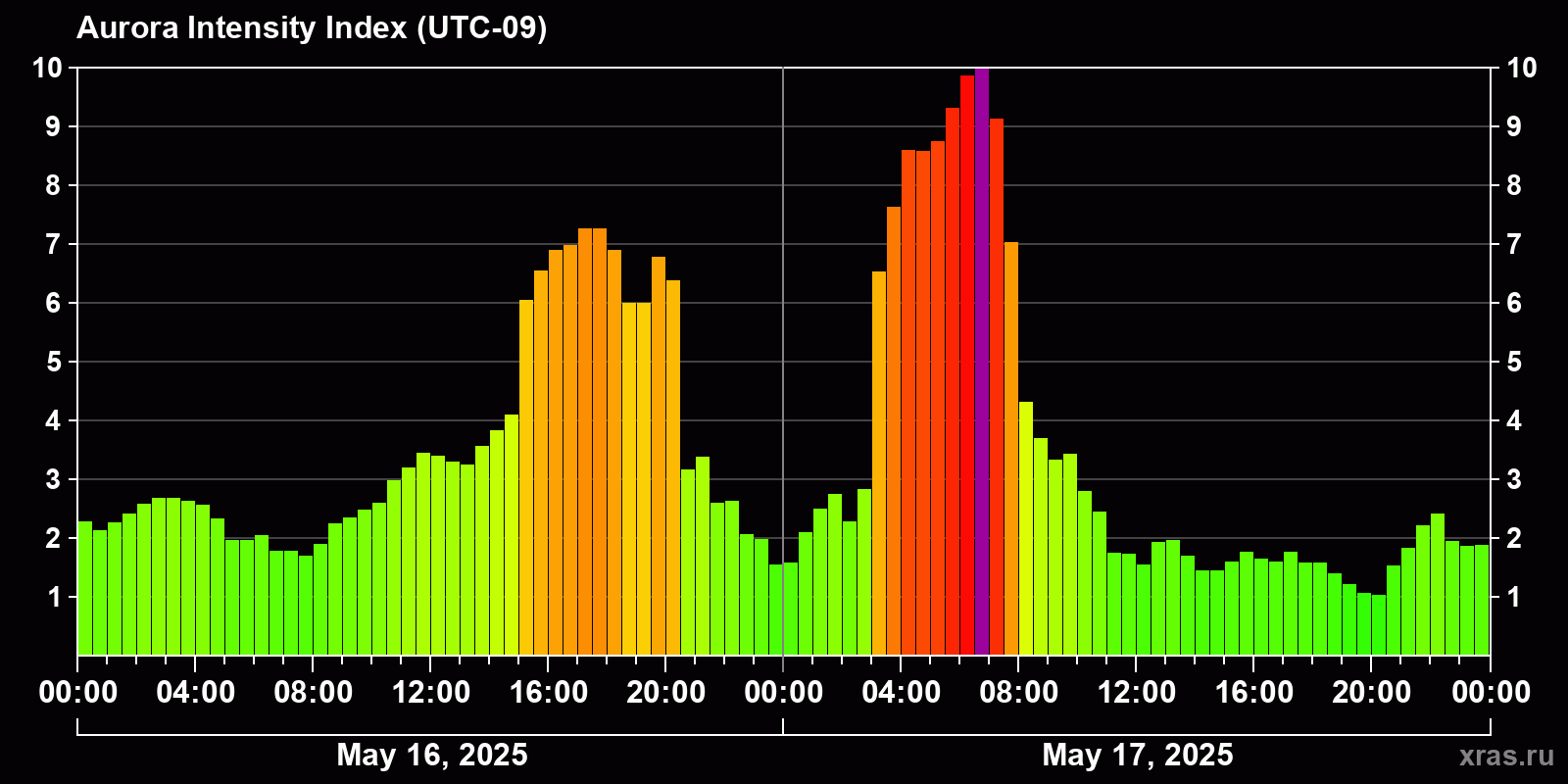 Changes in the auroral intensity index from 2025-05-16 to 2025-05-17 local time