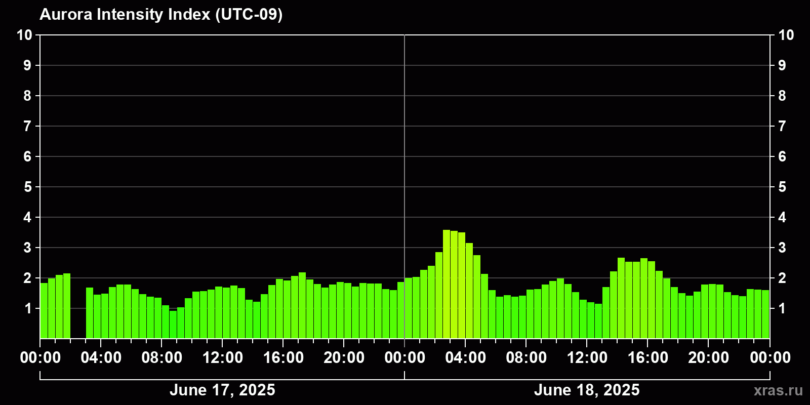 Auroral intensity index and the theoretically possible latitude of observations for nighttime in the Western Hemisphere as of 2025-06-18 23:58 (end of day) local time