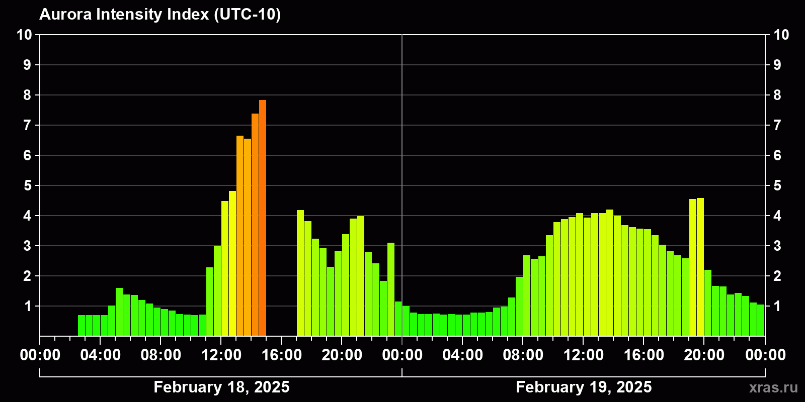 Changes in the auroral intensity index from 2025-02-18 to 2025-02-19 local time