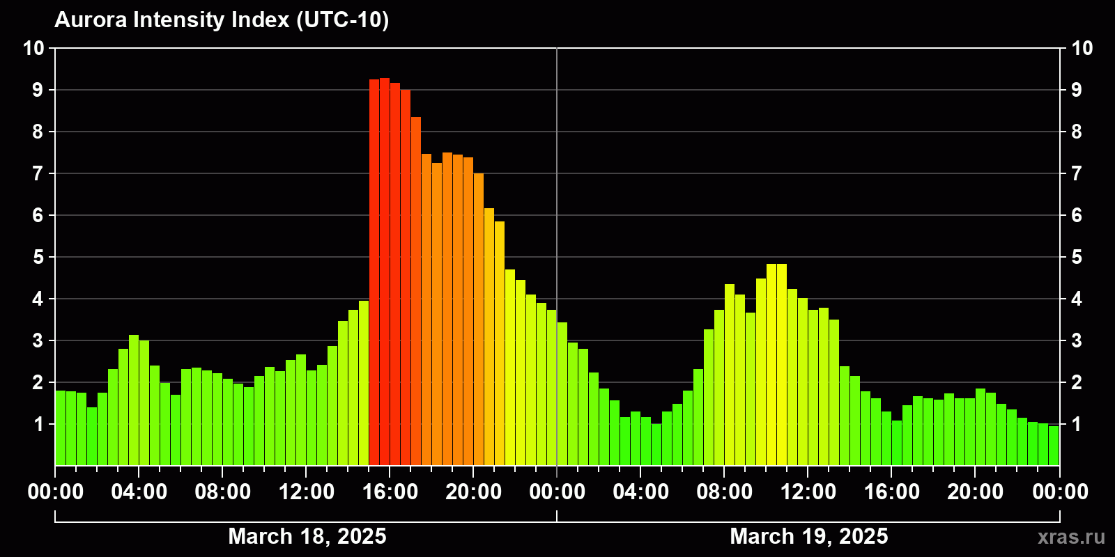Changes in the auroral intensity index from 2025-03-18 to 2025-03-19 local time