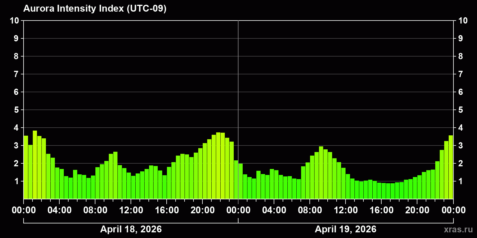 Changes in the auroral intensity index from 2026-04-18 to 2026-04-19 local time