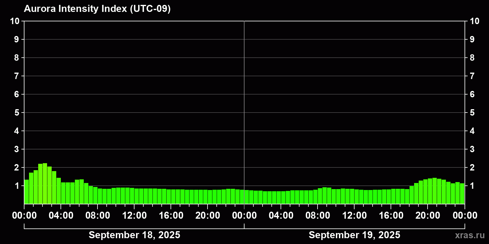 Changes in the auroral intensity index from 2025-09-18 to 2025-09-19 local time